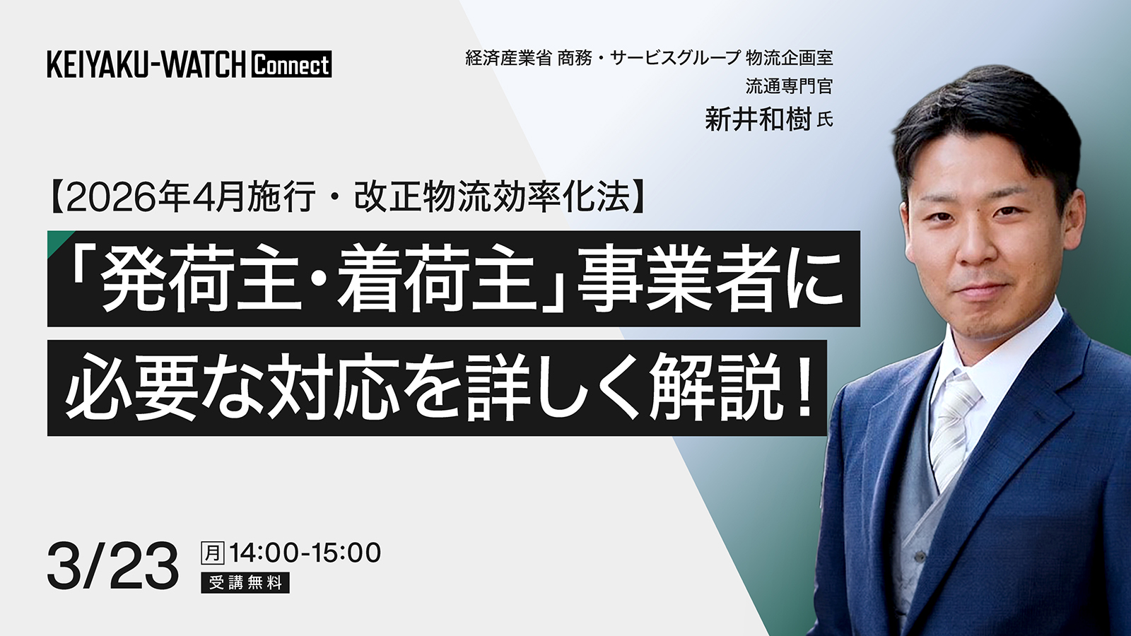 荷主事業者が理解すべき改正の概要や注意点についてご解説くださるのは、経済産業省で物流効率化法を担当されている流通専門官の新井和樹 氏です。