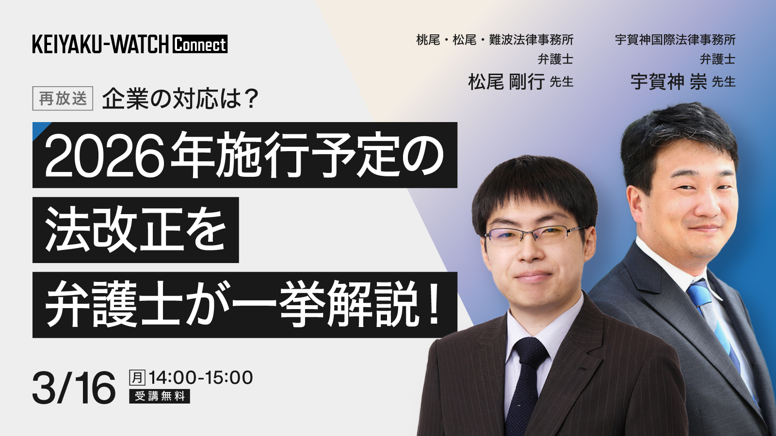 講師は、情報法を中心に企業法務や契約関係に関する助言のご経験が豊富な松尾剛行先生と、人事労務案件や国際法務などの企業法務に幅広く携わられている宇賀神 崇先生です。