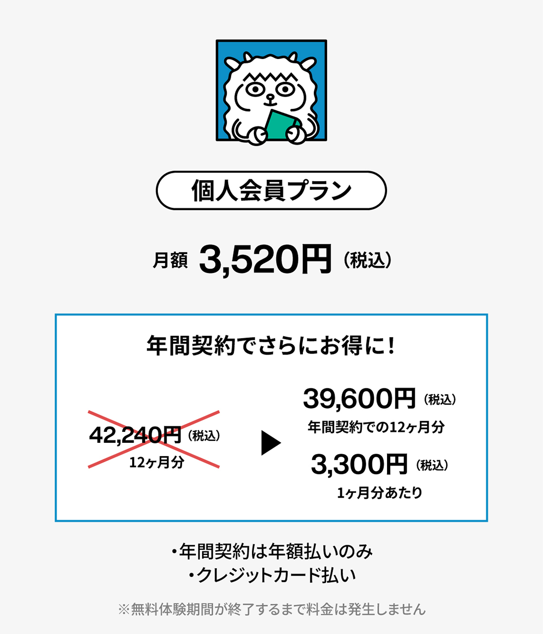 個人会員プランは、月額払いで気軽に始められ、年額払いだと約10%お得にご利用いただけます。