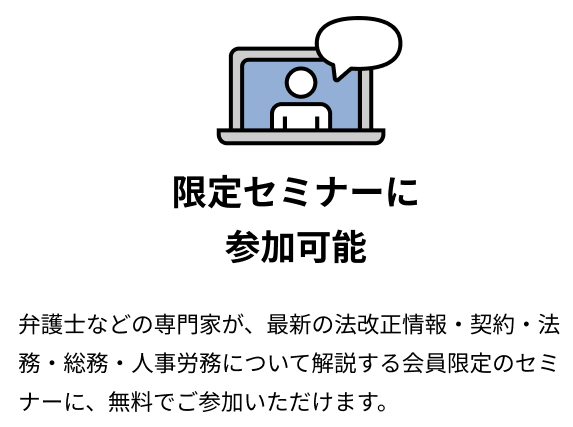 弁護士などの専門家が、最新の法改正情報・契約・法務・総務・人事労務について解説する会員限定のセミナーに、無料でご参加いただけます。