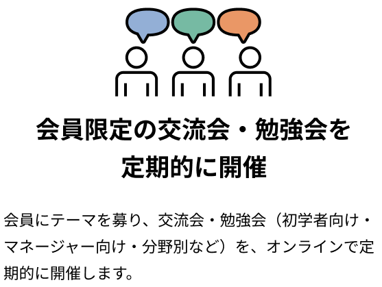 会員にテーマを募り、交流会・勉強会(初学者向け・マネージャー向け・分野別など)を、オンラインで定期的に開催します。