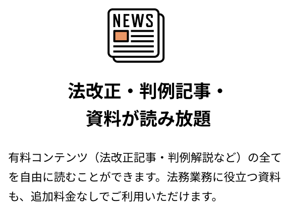 有料コンテンツ(法改正記事・判例解説など)の全てを自由に読むことができます。法務業務に役立つ資料も、追加料金なしでご利用いただけます。