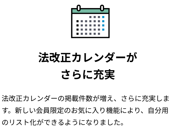 法改正カレンダーの掲載件数が増え、さらに充実します。新しい会員限定のお気に入り機能により、自分用のリスト化ができるようになりました。