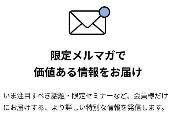 いま注目すべき話題・限定セミナーなど、会員様だけにお届けする、より詳しい特別な情報を発信します。