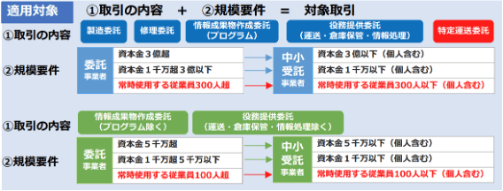 取適法が適用されるのは、業として行う以下のいずれかに該当する取引のうち、資本金要件または従業員数要件を満たすものです。